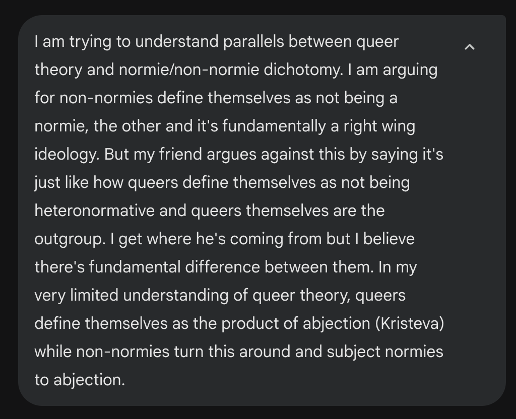 Speaking of Against the Non-Normie, I feel a bit uncomfortable about that piece. I believe what I said there but I feel uneasy because of the process I wrote it with. During our conversation, kerey raised the similarity between non-normies and queer community. Since gender studies and queer theory are not my forte, I asked Gemini to make the connection: